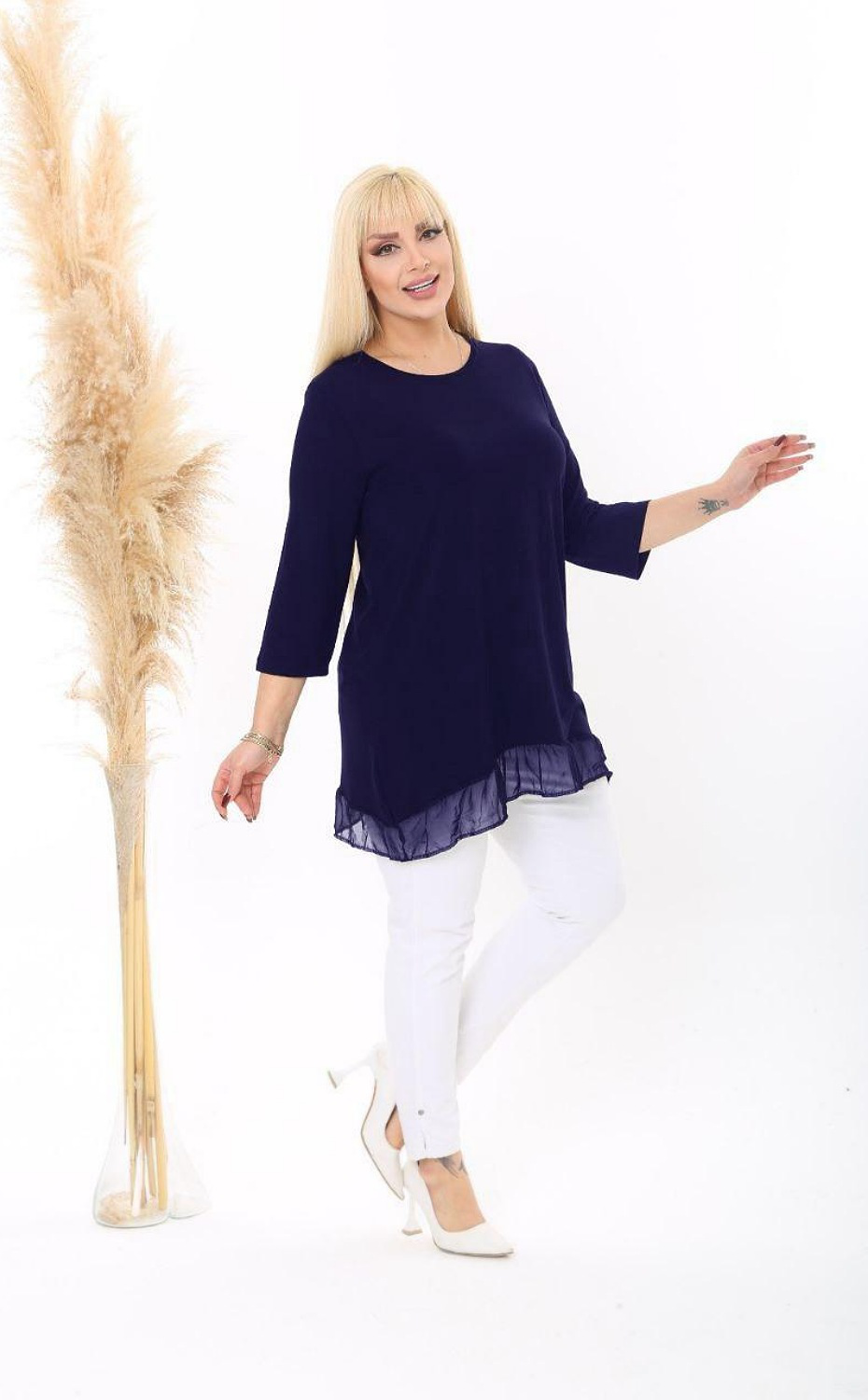 Bluză elegantă cu mâneci 3/4 și peplum din dantelă la capăt