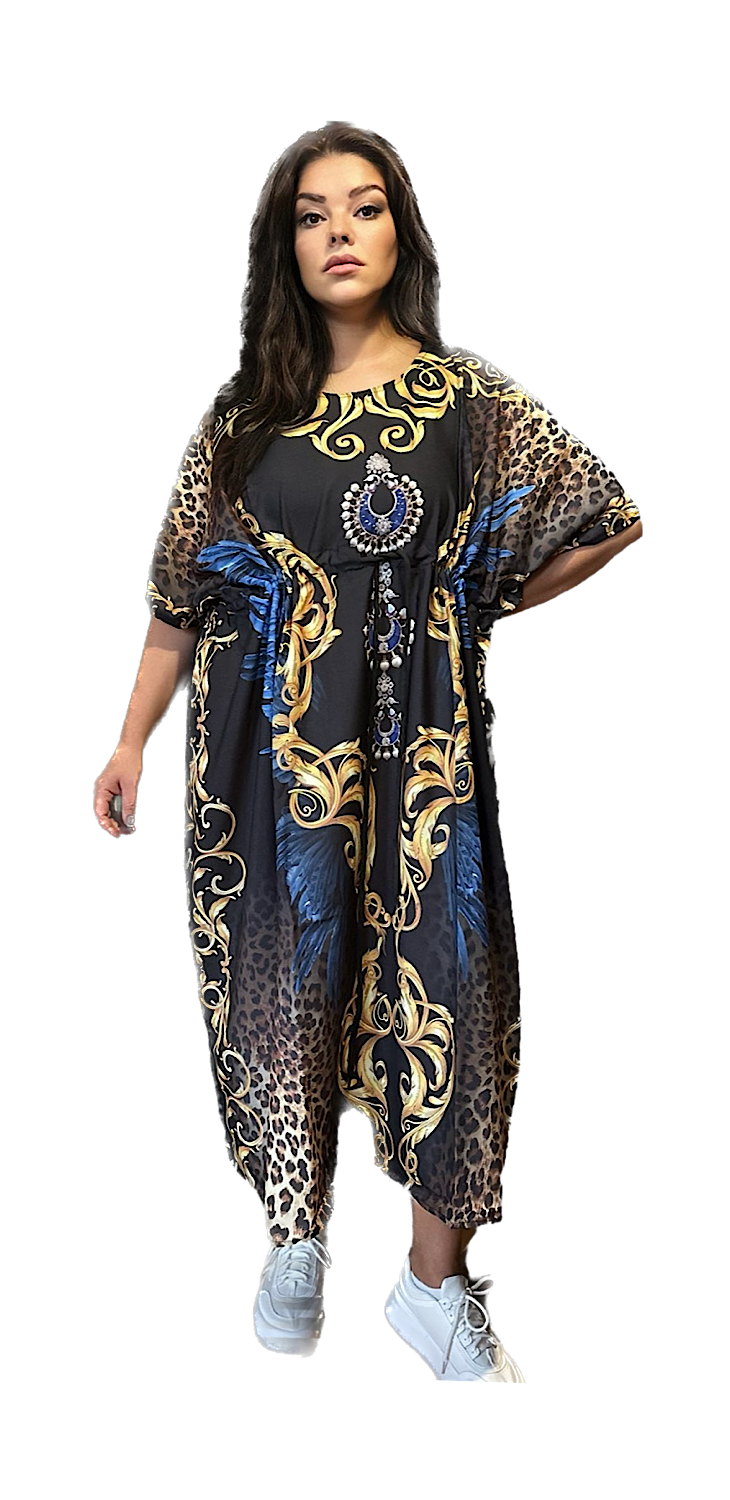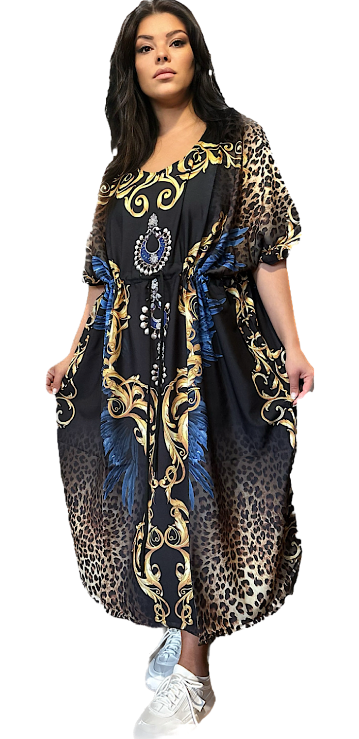 Rochie spectaculoasă de caftan de damă cu model unic. Modelul este confectionat din bumbac pur cu decolteu rotund si are curea pentru a se potrivi sub bust. O soluție excelentă pentru confortul și încrederea dumneavoastră seara și în viața de zi cu zi.