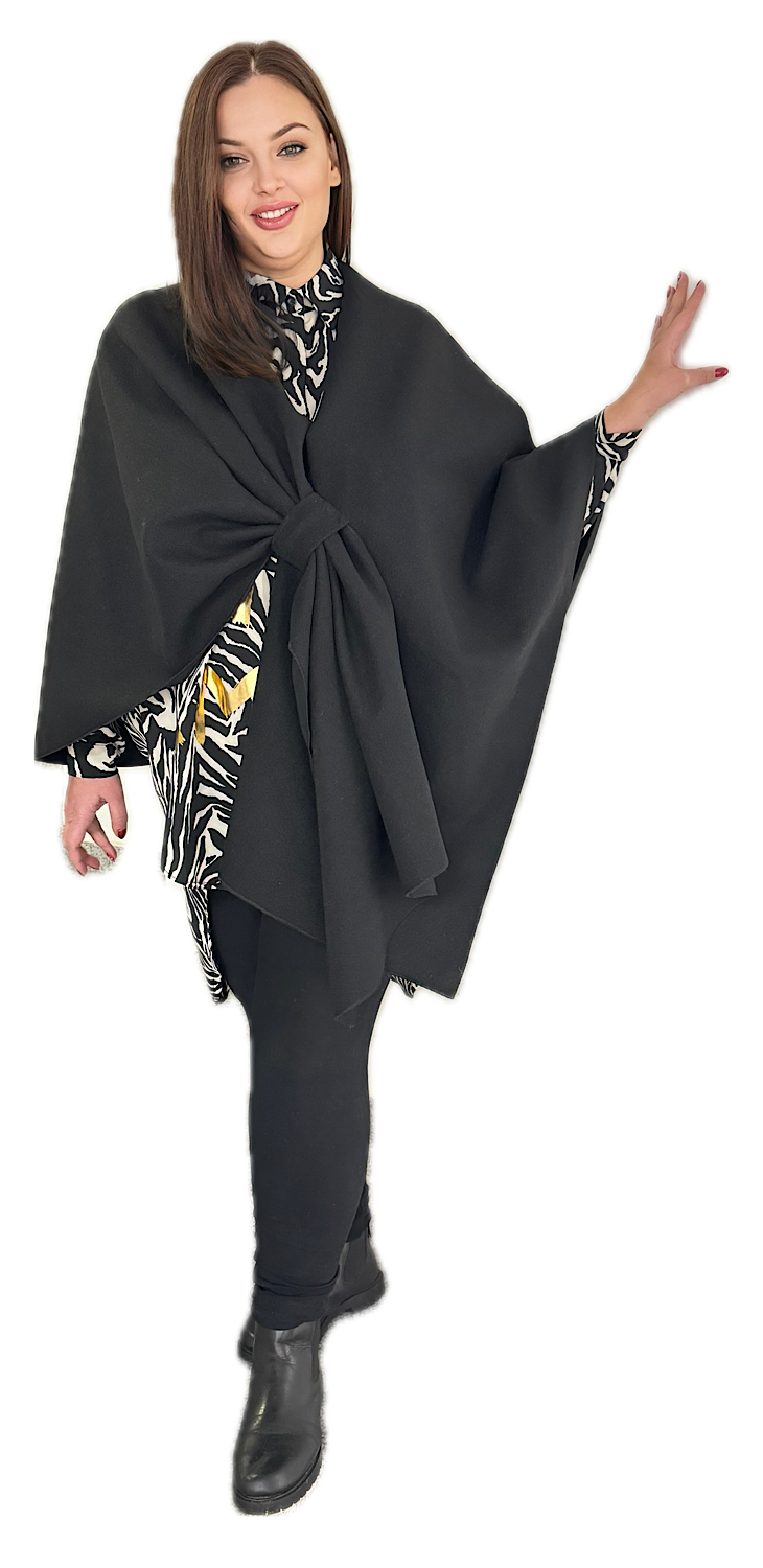 Poncho asimetric cu panglică din material care seamănă cu cașmirul. O soluție grozavă, elegantă și elegantă și o notă finală minunată pentru ținutele tale!