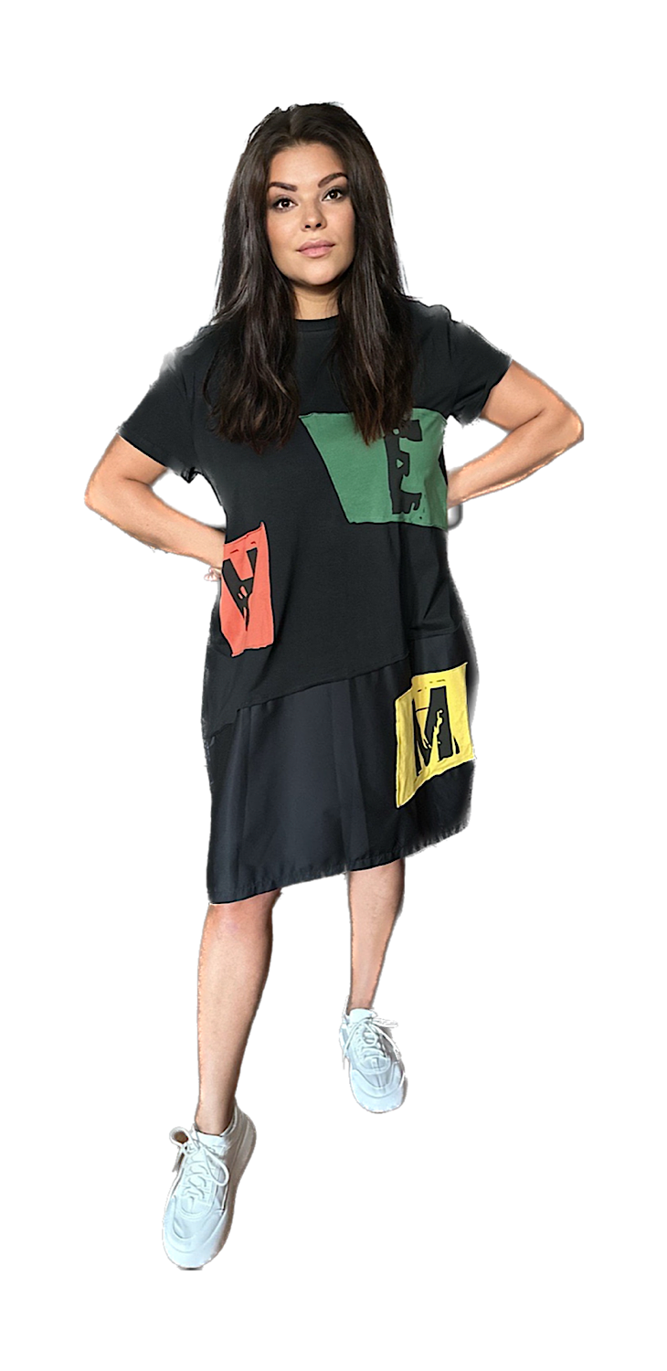 Această rochie neagră șic de vară are mâneci scurte cu imprimeu pătrat vibrant. Concepută cu o croială evazată pentru un confort maxim, este confecționată din bumbac și are un decolteu în formă clasică. O alegere elegantă și modernă pentru garderoba ta de zi cu zi.